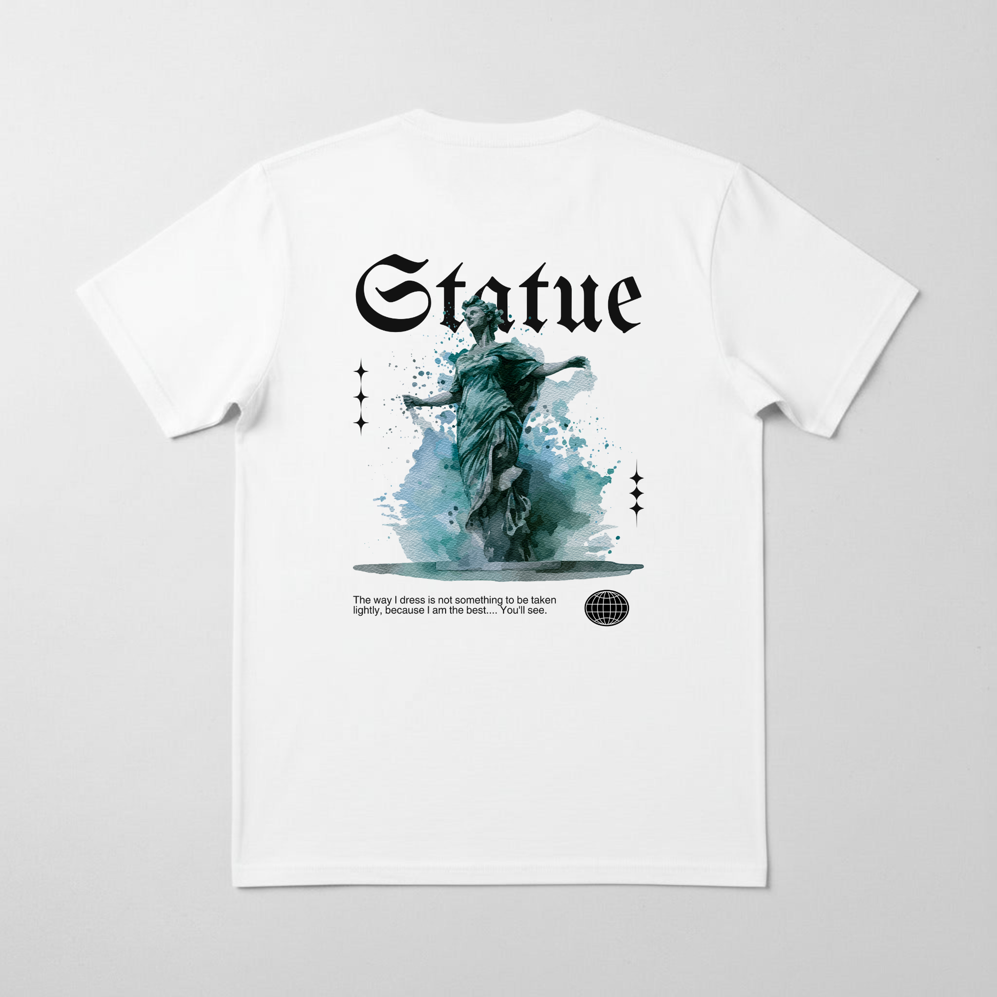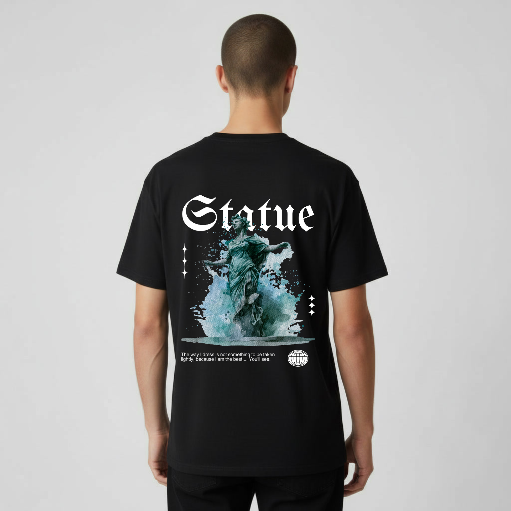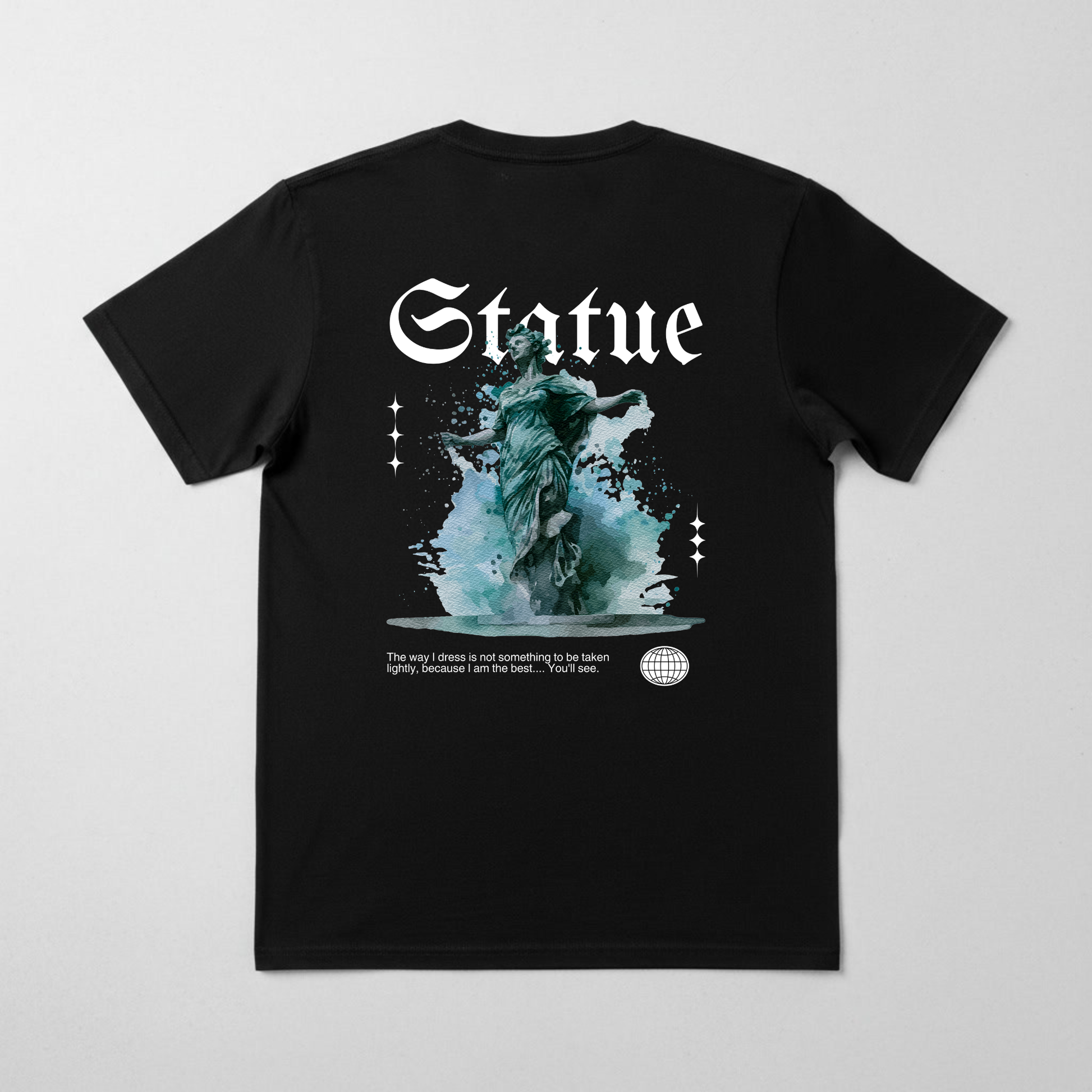 - DTF-printed sleeve accents plus large watercolor statue print on back